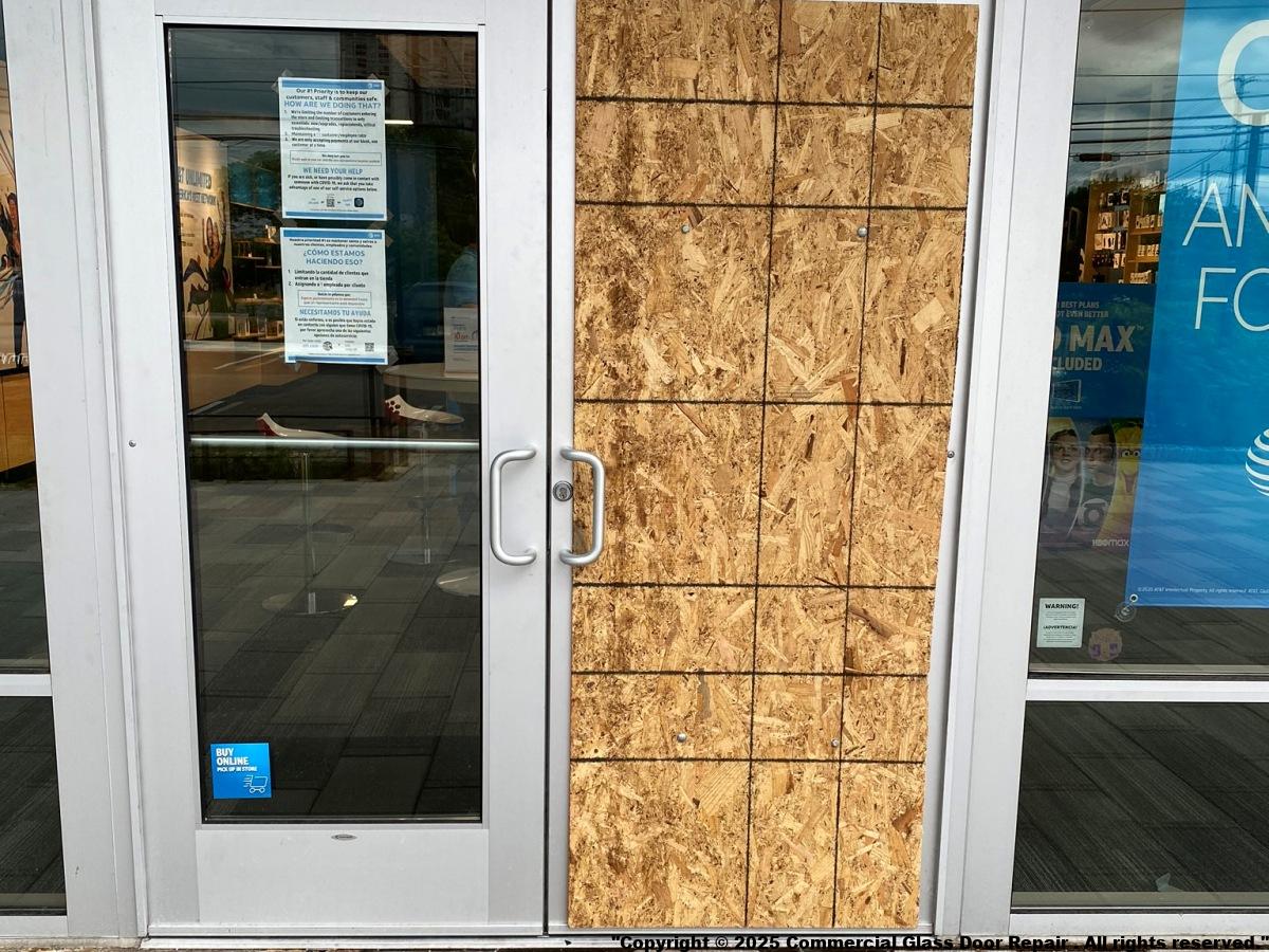 We carry different standard size storefront glass door and there is a good chance we will change the glass on the spot: That will save you the cost of the emergency board up.