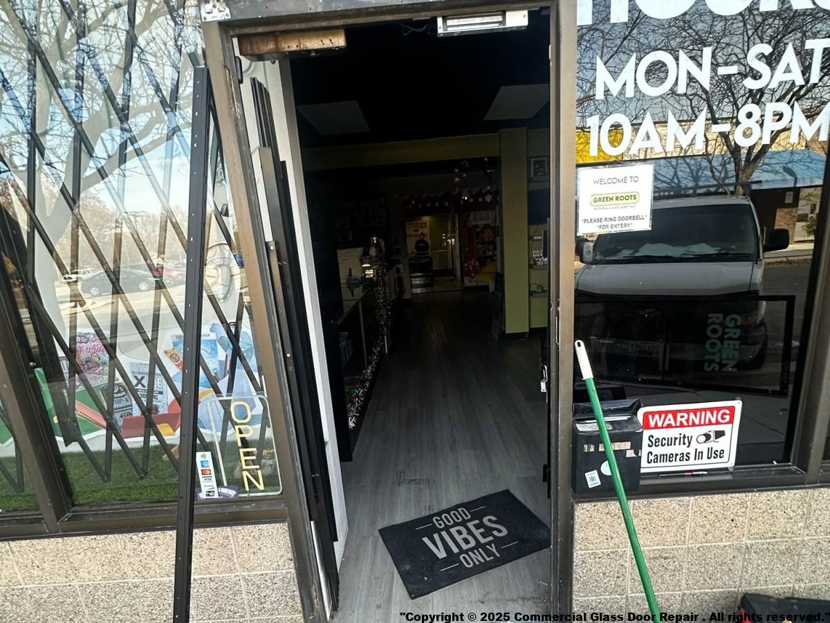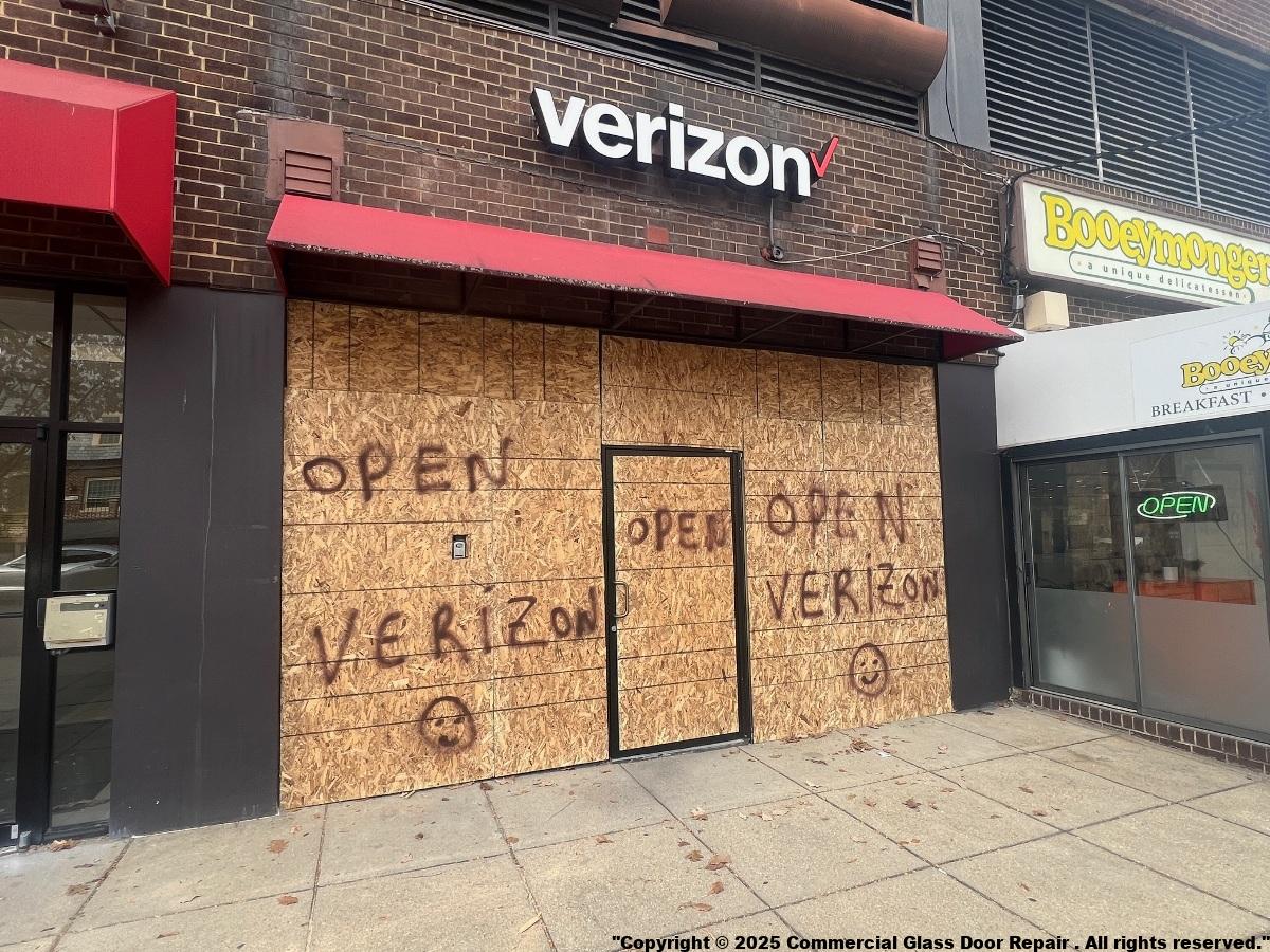 We carry standard size storefront glass door. Most likely we will change your glass door immediately and save you the cost of emergency board up and the head ache. In the event glass is custom size. We will cut it ( safety laminated glass ). We will provide same day service as well.